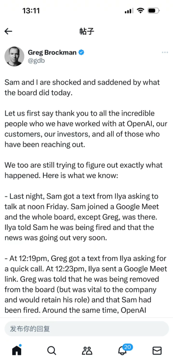 哦对了,OpenAI不仅罢免了Altman,也顺道将联合创始人兼董事长Greg Brockman一起踢走,Greg在X中说:“自 8 年前在我的公寓开始创建以来,我对我们所有人共同构建的东西感到非常自豪,但根据今天的新闻,我辞职了。”