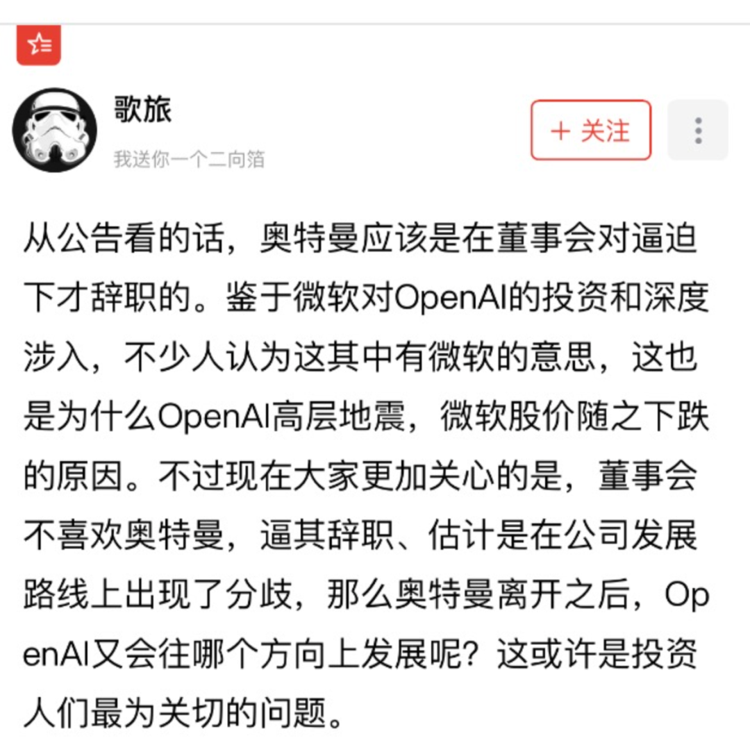 有网友辣评:“从公告看的话,Altman应该是在董事会逼迫下辞职的。鉴于微软对OpenAI的投资和深度涉入,不少人认为这其中有微软的意思,这也是为什么OpenAI高层地震,微软股价随之下跌的原因。”