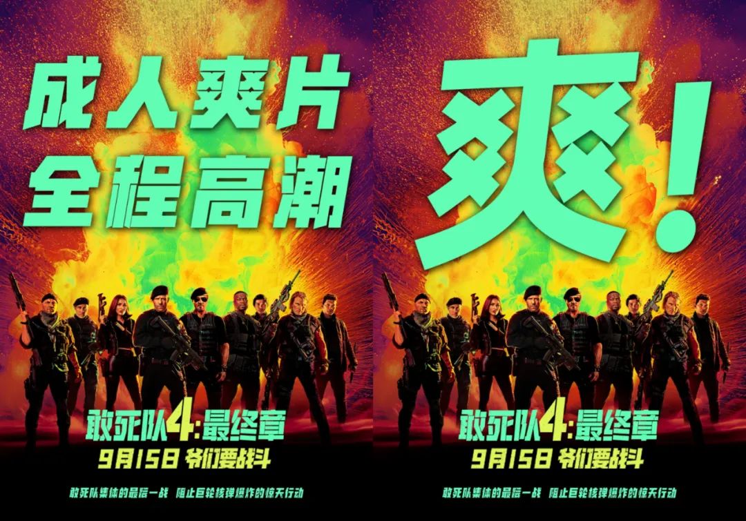让人汗颜的大胆用词引来了部分观众的投诉,此宣传图也被打入冷宫,不再使用它进行大肆宣传。《敢死队4》之后经常使用的宣传海报同样槽点很多,荧光绿的超大“爽”字,直白又添点俗气。