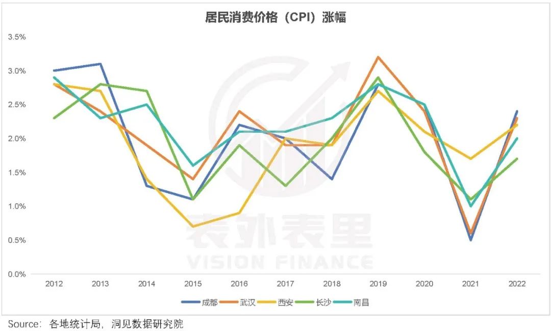 对比5座城市近10年CPI指数也可以发现,西安确实将物价控制得较为平稳。