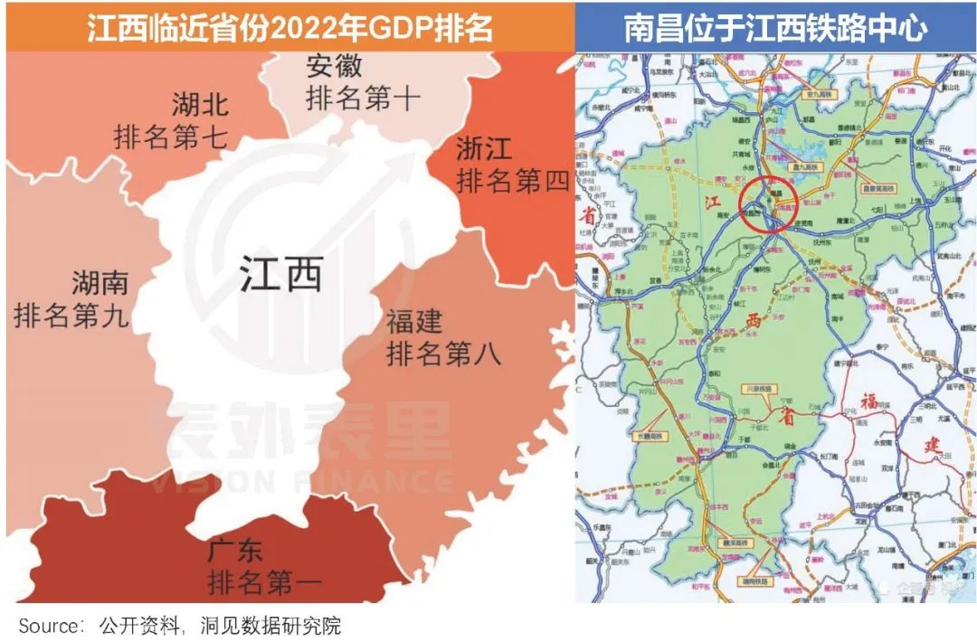 甚至在通达度上,南昌也不比长沙、武汉弱多少。可以看到,南昌地理区位相当优越——位于省内交通网中心,周围都是高GDP省份,无论哪个方向的来客,都难逃其掌心。