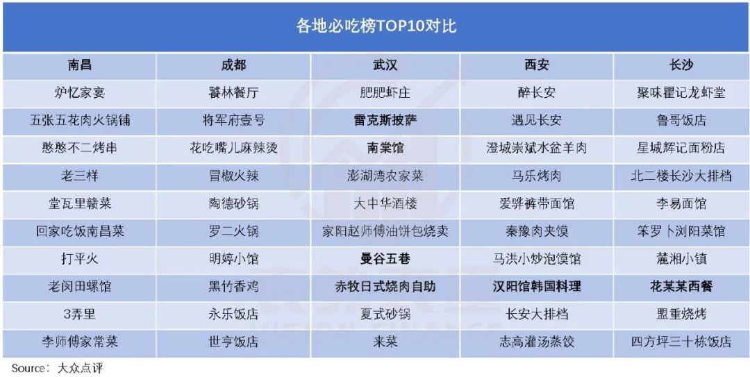 反观其他城市,或多或少都有其他菜系乱入,尤其是武汉,榜单中出现了4家日式烤肉、意大利披萨、粤菜等连锁餐饮,地方特色菜占比明显不如南昌。