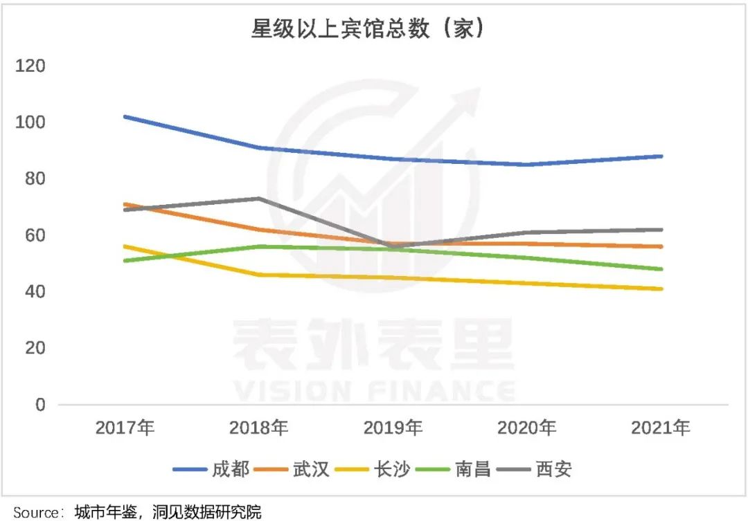 不仅是吃,在住宿方面,南昌的实力也不容小觑。比如,其星级酒店的数量达到了碾压长沙,追赶武汉、西安的水平。