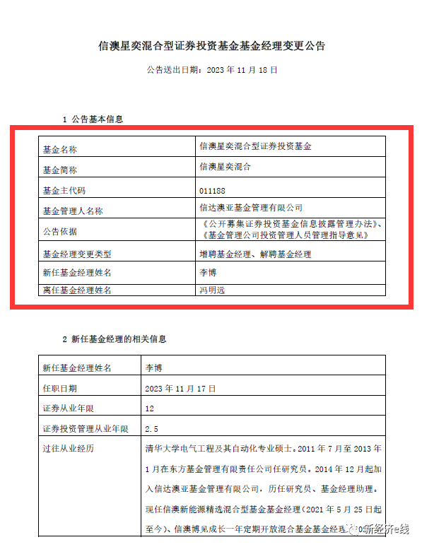 2023年11月18日,信达澳亚基金旗下信澳星奕混合(A/C)和信澳科技创新一年定开混合(A/C)双双发布基金经理变更公告称,因内部调整,冯明远离任以上两只基金的基金经理职务,分别由李博和吴凯接任。