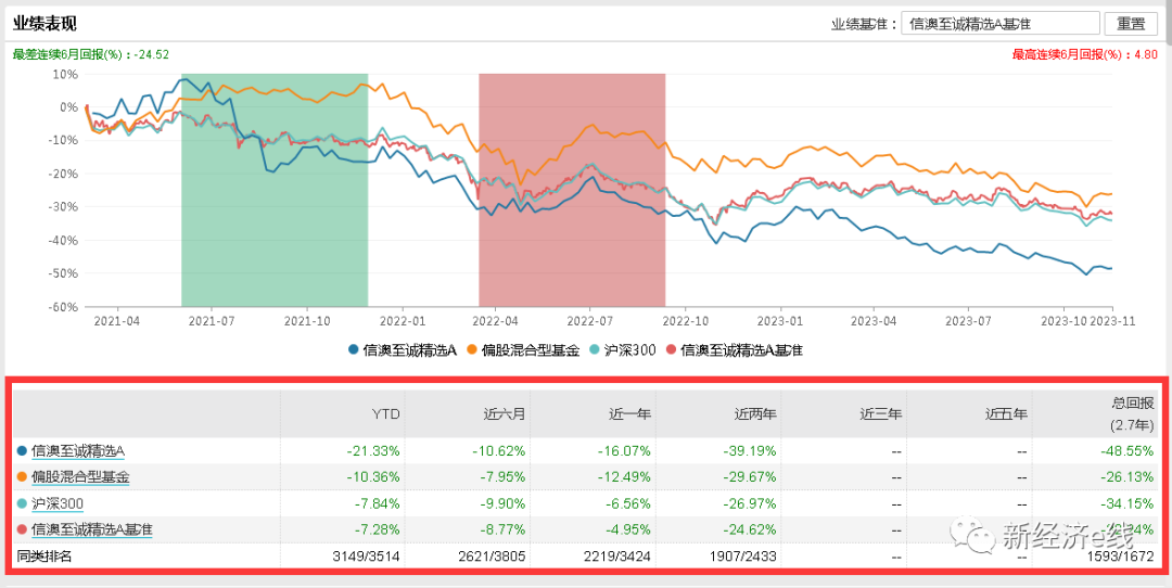 其中,任职回报最低为邹运管理的信澳至诚精选A,该基金为偏股混合型基金。Wind统计表明,截至2023年11月17日,邹运自2021年3月2日该基金成立以来便出任基金经理,其任职回报低至-48.55%,年化回报为-21.71%,回报排名落后至1593/1672。基金最新单位净值已低至0.5145元,年内净值增长率-21.33%,同类排名3149/3514,大幅跑输同期业绩比较基准(沪深300指数收益率*75%+中证港股通综合指数收益率*20%+中债综合财富(总值)指数收益率*5%),后者为-7.28%。