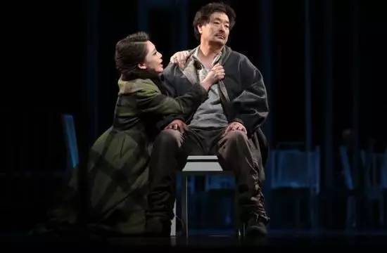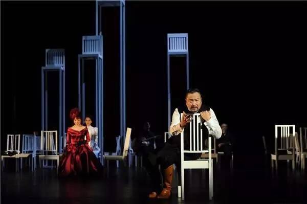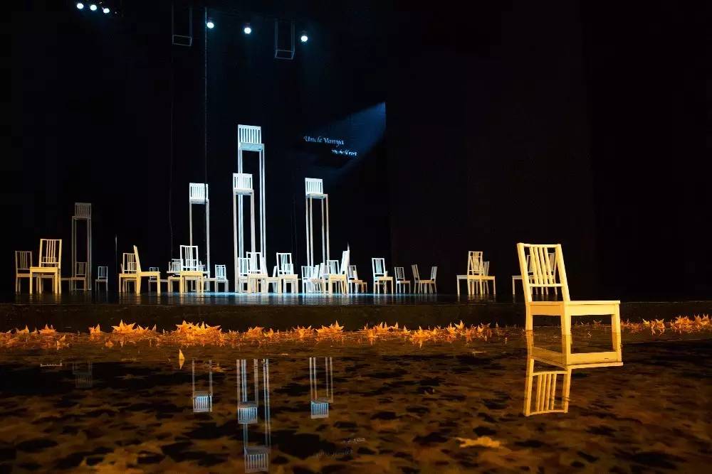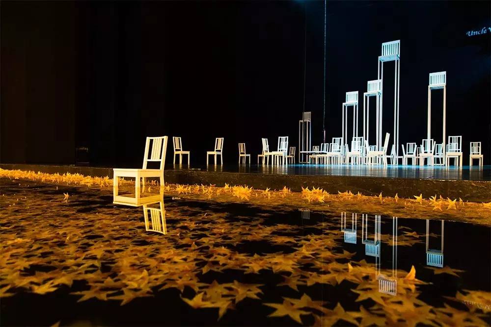 二十多把低椅子分隔出不同空间,又让演员表演行动自如不受拘束;高椅子的三个层次,让观众仿佛看到庄园楼层的不同窗户,简练而具象,它们的摆放与位移,精心传递出人物行动指向和内心的欲望及其纠结,成功完成了导演富有特色的艺术表达。