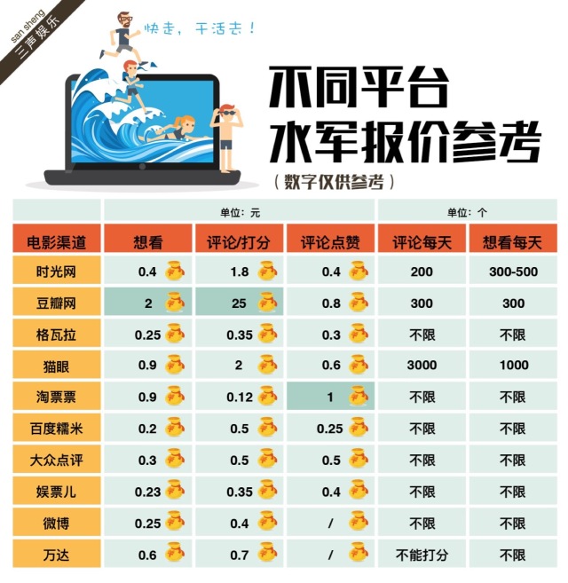 评分服务的种类很多,一家水军公司也告诉《三声》,“有些很冷门的电影,上映时连评分都没有,因为达不到评分人数。我们也会有这个服务,首先可以让电影有分数显示”。