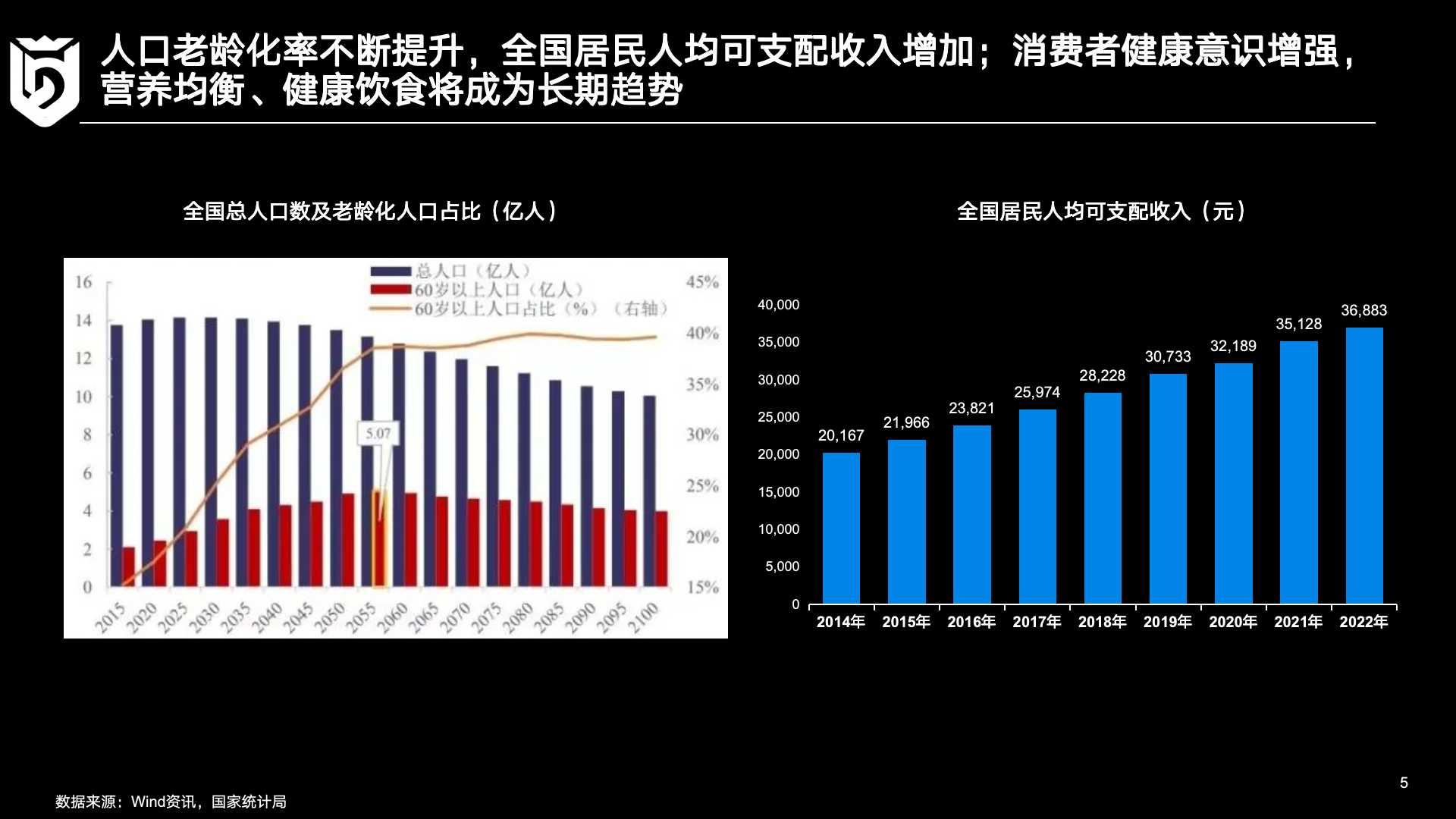 时间维度再拉长,在健康消费趋势下,调味品行业产品创新、价格定位的转向均指日可待。依据国家统计局发布的人口数以及老龄化人口数据情况,老龄化人口正呈现出稳定增加趋势,直至2055年左右达到顶峰状态。在如此的人口结构变化之下,餐饮消费习惯向减盐低脂的方向转变也是大势所趋。