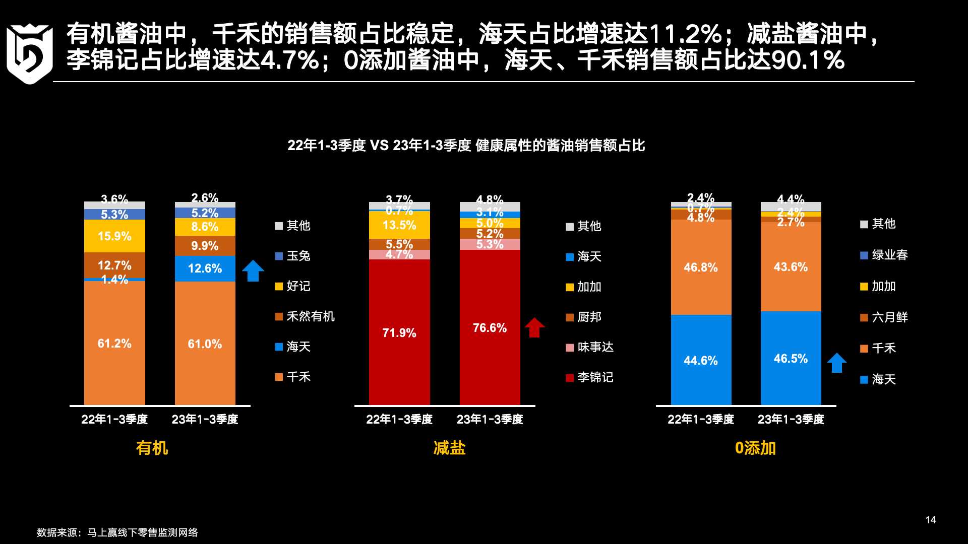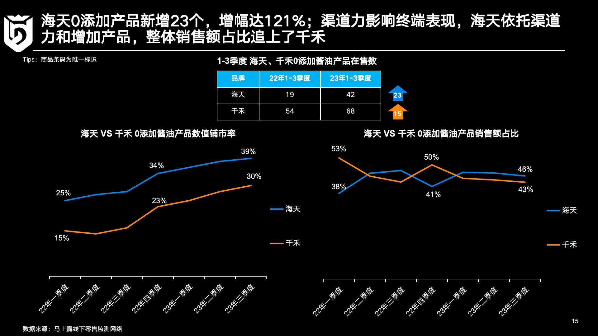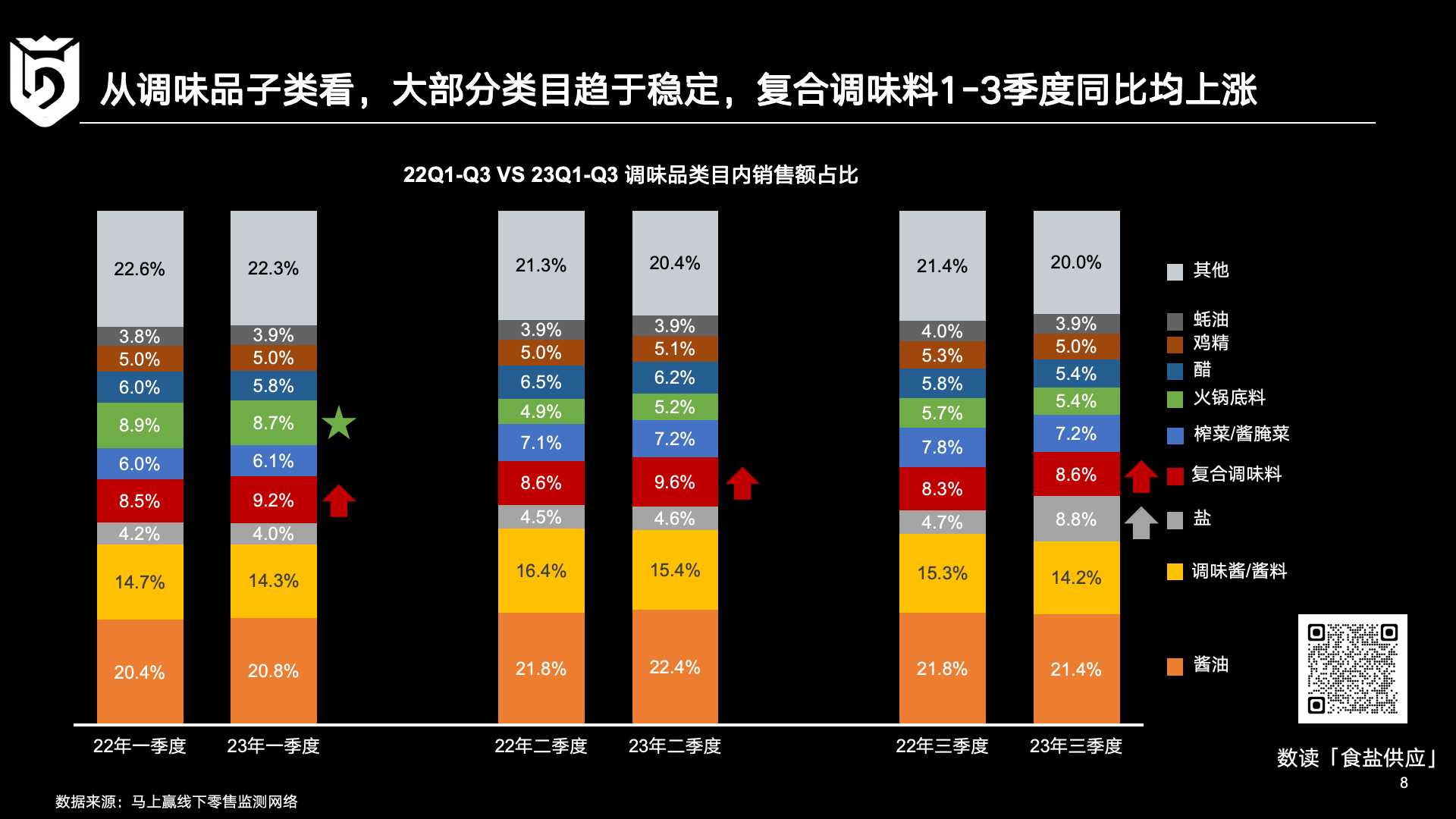 回到调味品行业本身,马上赢基于线下零售监测网络相关数据进行了更深入的观察。在2022年和2023年的三个季度数据对比中,三个有趣的现象值得关注: