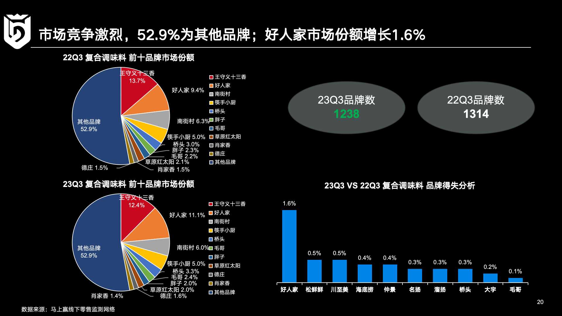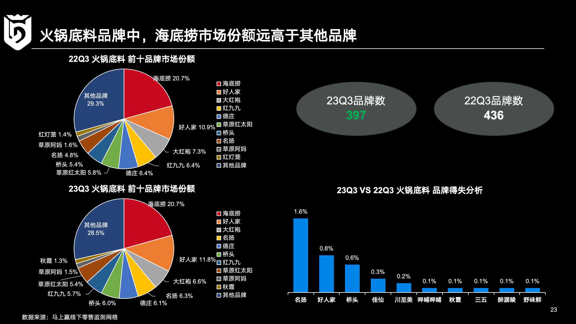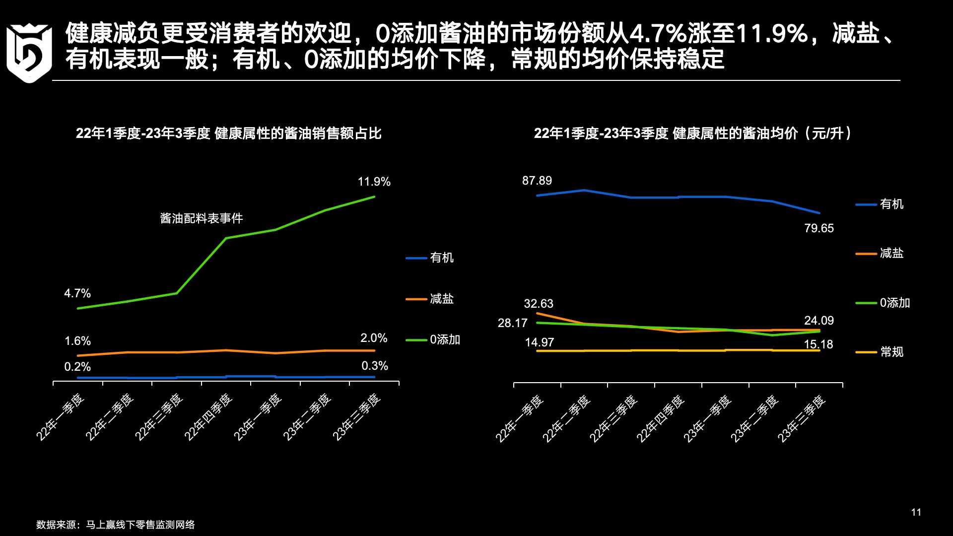 回到调味品行业本身,马上赢基于线下零售监测网络相关数据进行了更深入的观察。在2022年和2023年的三个季度数据对比中,三个有趣的现象值得关注: