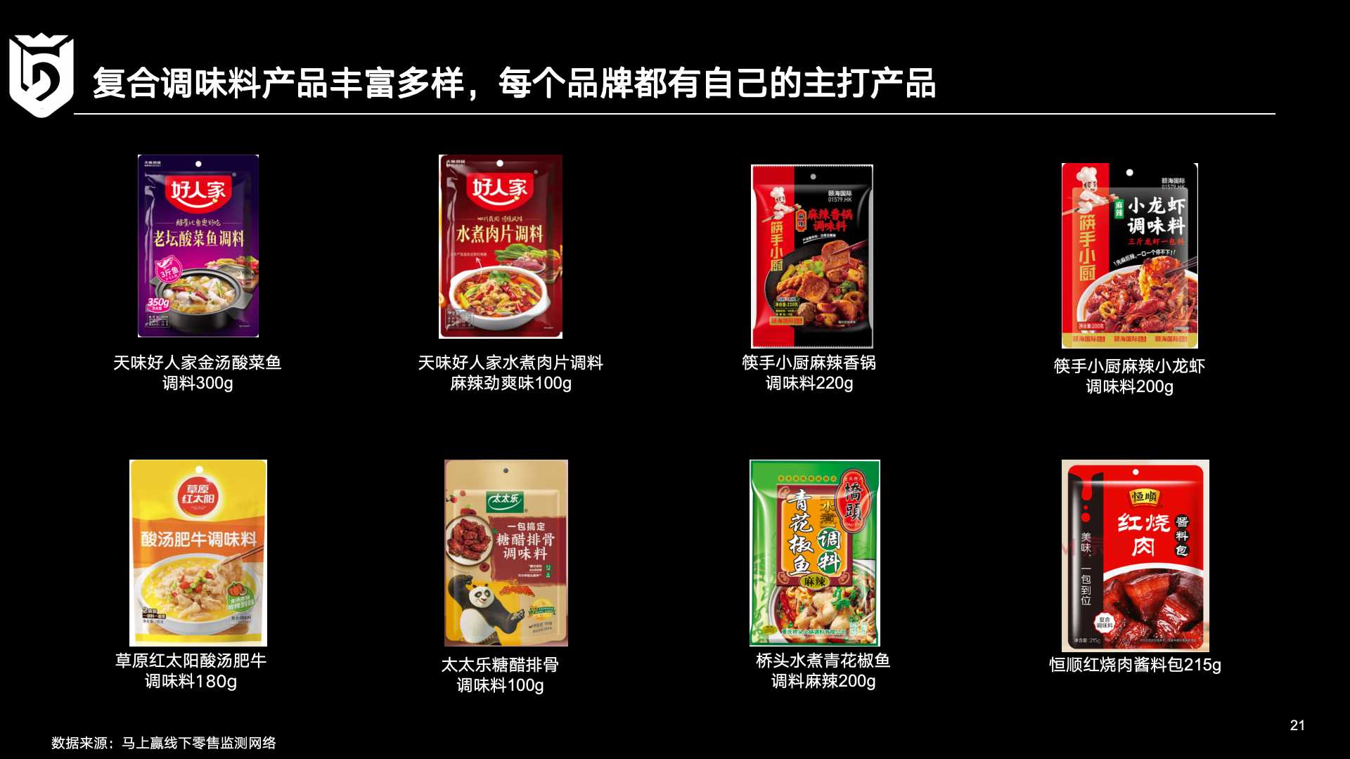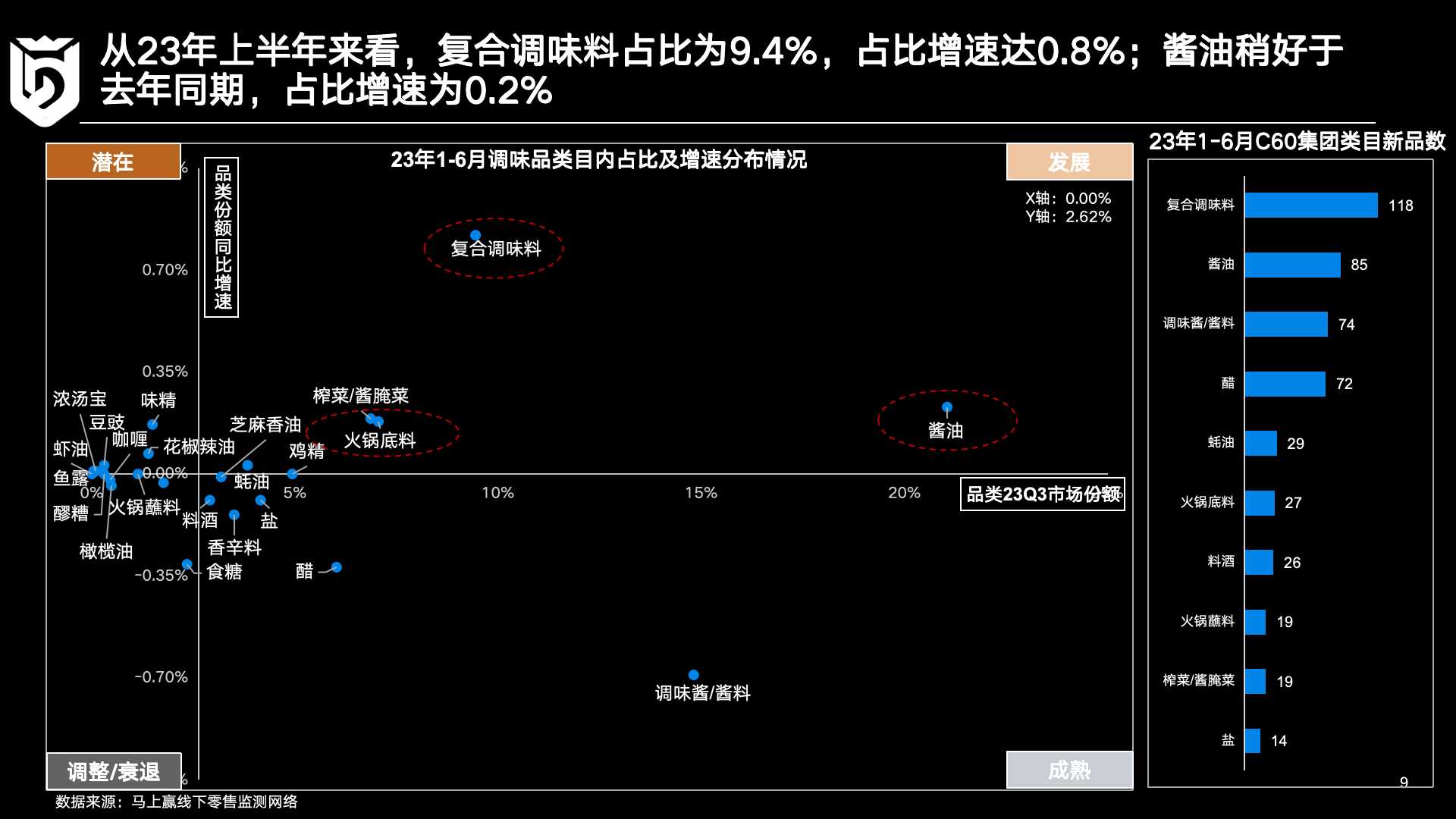 除此之外,马上赢还从市场份额占比及其增速、集团类目新品数的角度可视化呈现了调味品各品类的发展态势。其中,复合调味料、酱油以及调味品的数据在对比之中十分耐人寻味。就新品数量而言,复合调味料以118个新品稳居首位,而酱油、调味酱则分别以85个、74个新品紧随其后。在这三个细分品类之中,酱油、复合调味料的市场份额均保持了增加趋势,但调味酱/酱料市场份额却出现了下跌,令人出乎意料。对此,马上赢依据其他细分品类的市场数据变动进行了初步的假设和判断:复合调味料的使用会减少调味酱的用量,复合调味料的增长便相应地会对调味酱品类的发展和增长产生一定程度的影响。在此基础上,考虑到复合调味料近期的增长态势,调味品企业对复合调味料市场的关注以及相关战略的调整至关重要。