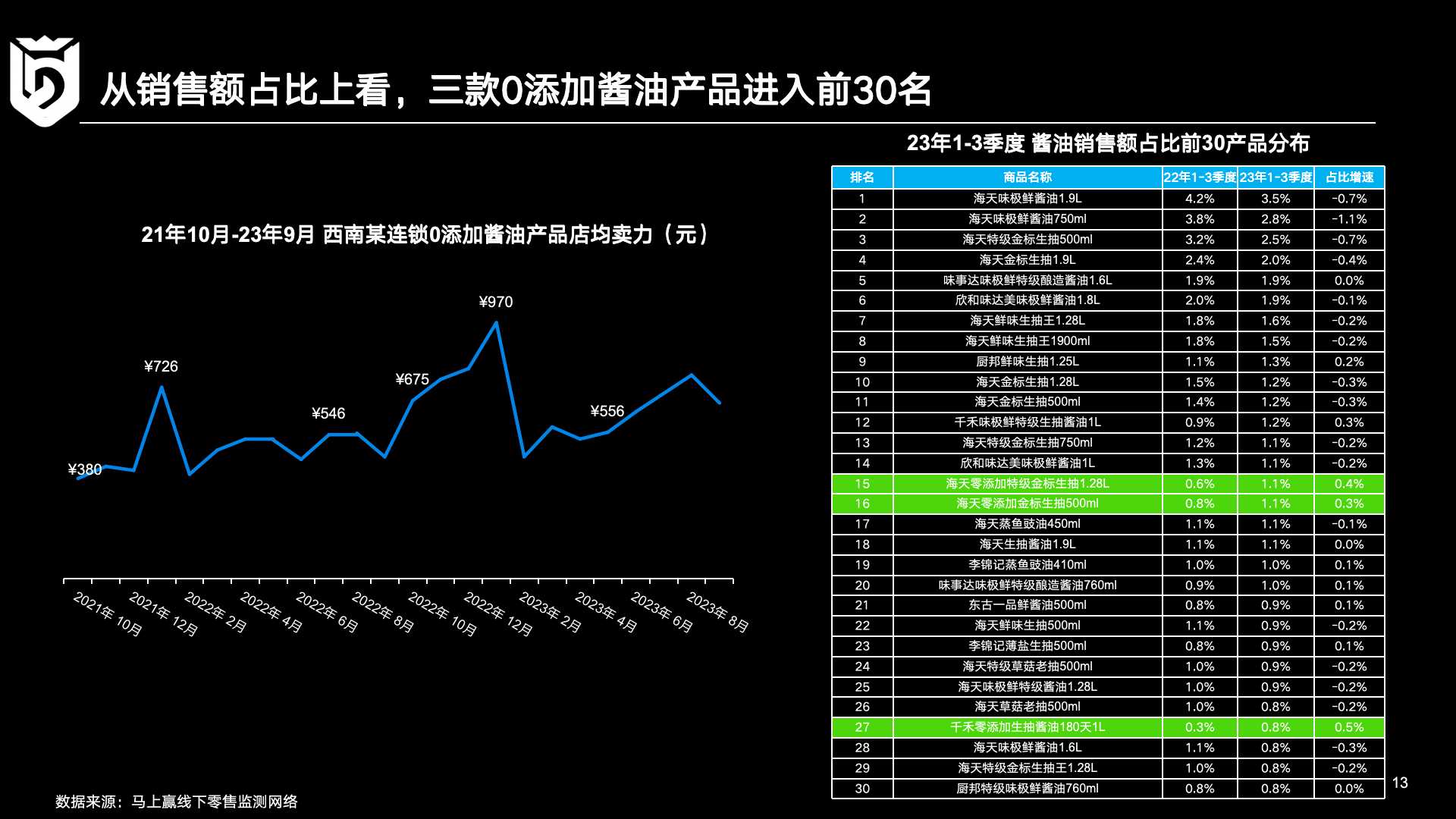 为进一步了解「零添加」酱油产品的市场销售情况,马上赢分析了2021年10月到2023年8月某西南连锁门店中「零添加」酱油产品的售卖数据。总体来看,「零添加」酱油产品在这一门店中呈现出缓慢、持续增长的态势,而从10月至春节期间则出现了持续增长高点。具体到产品看,在整个酱油细分品类销售额占比前30的产品中,已有三款「零添加」的产品位列其中,分别属于海天、千禾两个集团。对于在酱油整体销售份额中仅占10%~15%的「零添加」产品而言,这一数据结论可谓十分不易,也正显示出「零添加」产品的来势汹汹。
