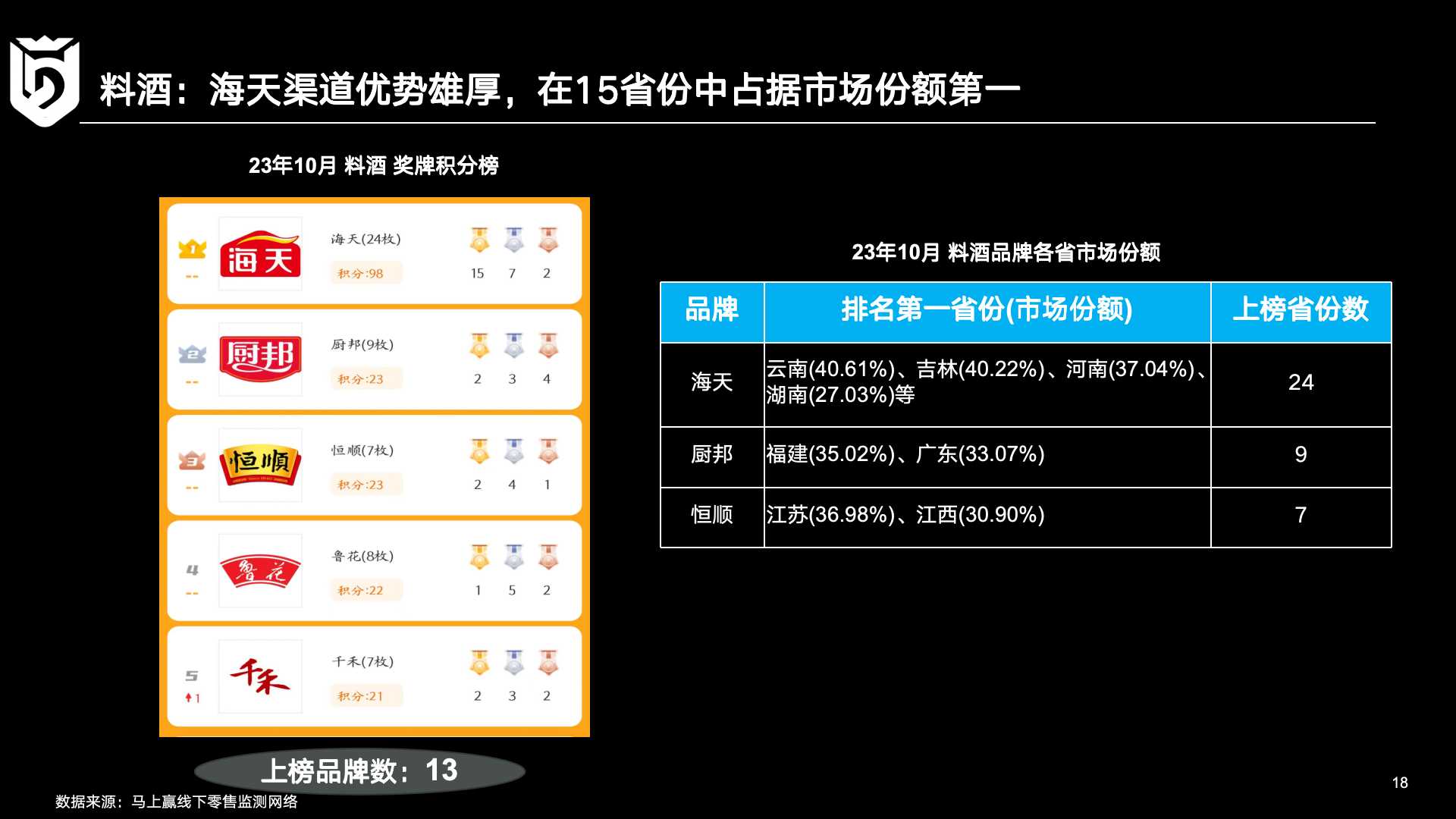 马上赢对醋、料酒两类产品的区域市场观察中,引入了奖牌积分榜的概念,以积分排名的方式形象地呈现头部品牌在全国的渠道布局情况。当一个品牌在某一省份市场份额取得第一名时,便标注为金牌并累积积分5分,银牌、铜牌分别累计3分、1分。