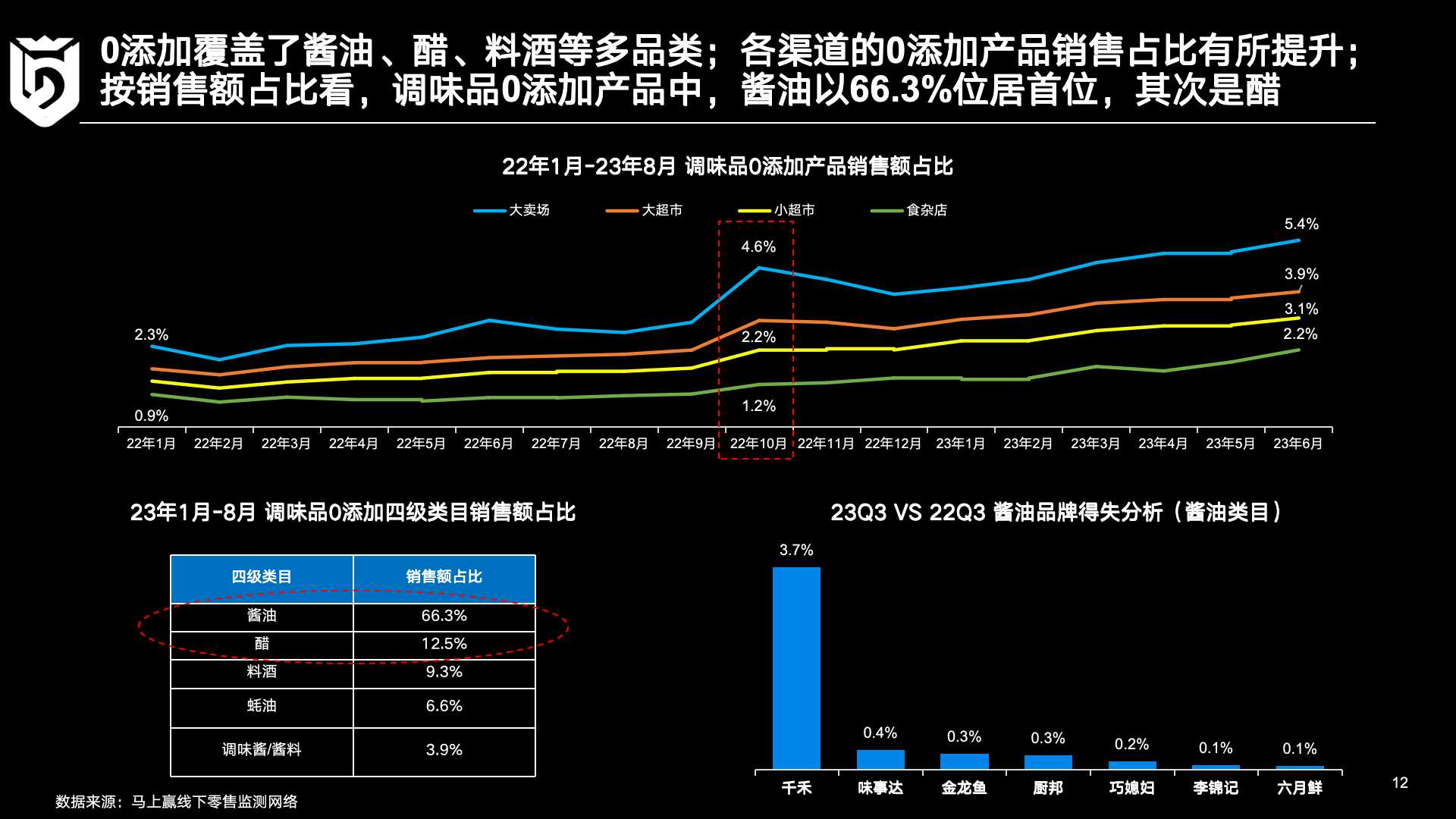 从业态的角度观察「零添加」产品的销售表现,不难发现从2022年1月到2023年6月,「零添加」的产品在大卖场、大超市等五大业态内均保持了稳步上涨的态势。其中,2022年10月相关数据出现了一次突然的提升,这一数据变动在大卖场数据中尤为明显。而从细分类目着眼观察,酱油以66%的高销售额占比显现出这一品类对「零添加」概念的高度关注。此外,醋类产品的12%、料酒产品的9.3%数据也相对较高。基于数据,马上赢也关注到这品类内的品牌得失情况:数据显示千禾在这个赛道中受益颇大,但仍未形成一家独大之势,其余品牌也有小幅提升、正奋力追赶。