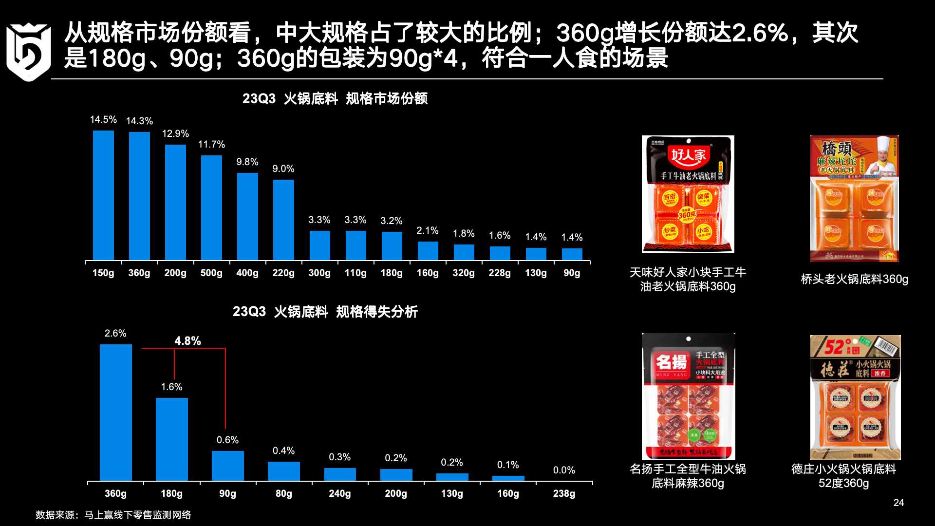 就规格而言,150克/件的规格以14.5%的市场份额拔得头筹,360克/件和200克/件各自占了10%左右的市场份额。粗看之下,大规格在火锅底料市场中似乎更受消费者青睐。但从增速的角度看,由四袋90克小包装组成的360克产品、由两袋90克小包装组成的180克产品和90克产品分别位居市场份额增速排名前三。也就是说,90克的小包装凭借其便捷性、充分利用性而被更多消费者选择,正领涨的整个火锅底料市场份额增长,值得市场投入更多关注。