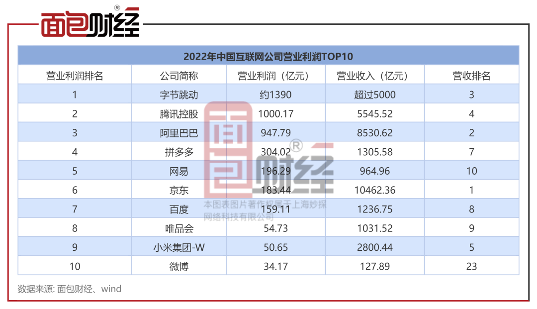 另一个新出现在榜单上的是拼多多,2022年的营业利润超过300亿元,远超京东的183.44亿元。