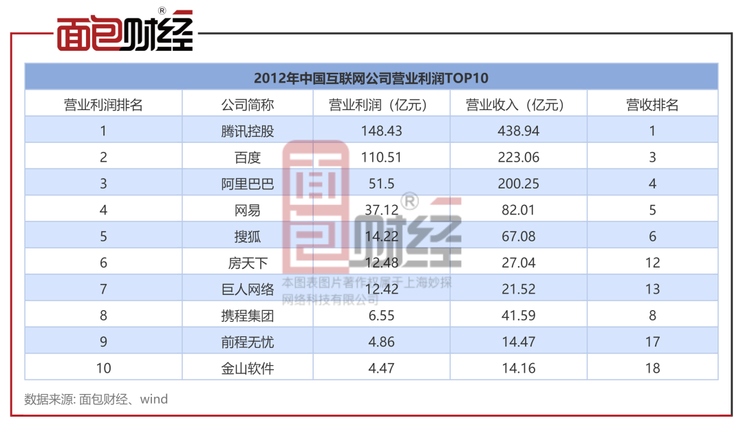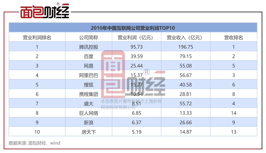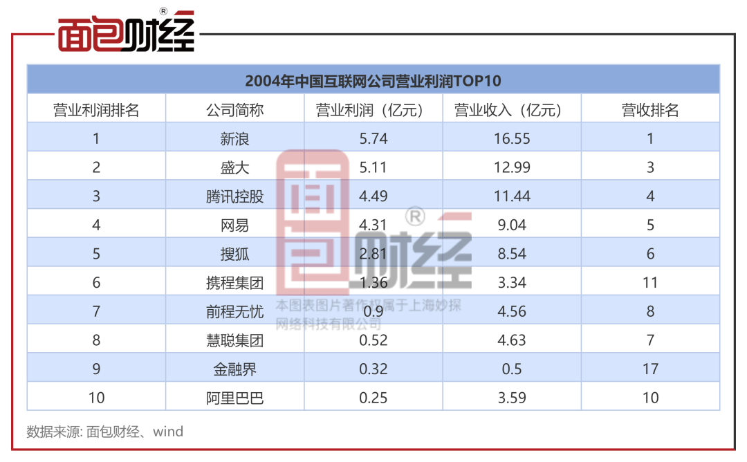 2004年,是首个真正能够排出拥有含金量的中国互联网营业利润前10强榜单的年份,这还要得益于IPO招股书中向前追溯3年披露的历史财务数据。榜单上的百度和阿里巴巴要到2005年和2007年才第一次上市。