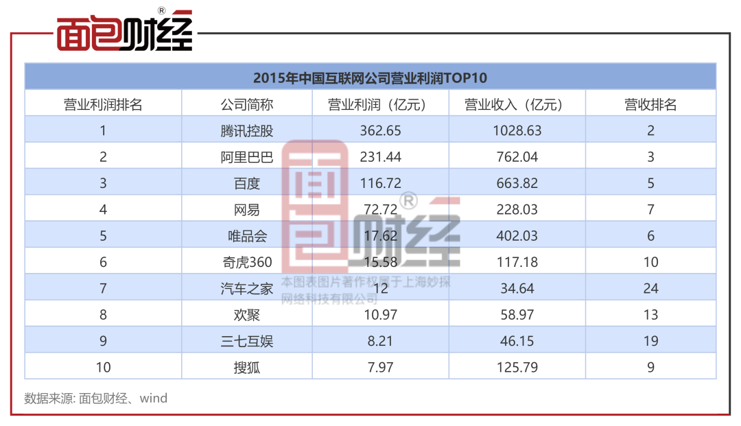 这一年的榜单上,首次出现两家百亿利润公司,腾讯和百度。京东的营收已经超过百度位居第二,但由于仍处于亏损期,迟迟不能进入营业利润前10强。