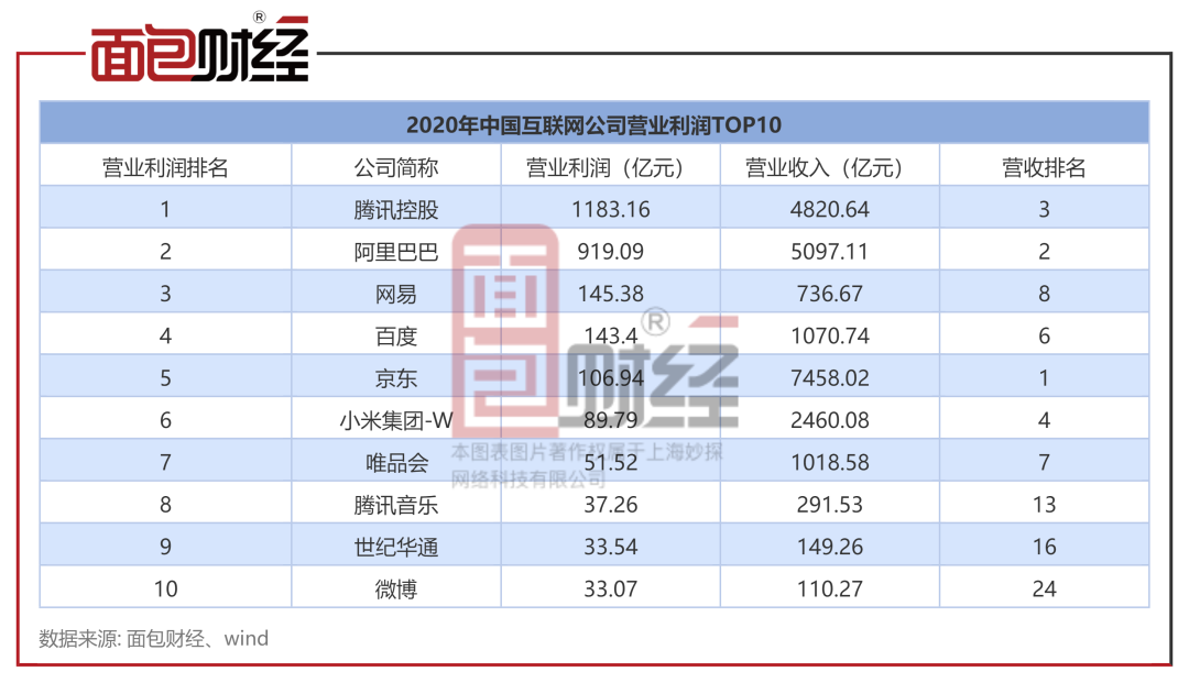 2020年,中国互联网巨头进入“双千亿”时代,首次出现了营业利润超过1000亿人民币,和营业收入超过1000亿美元的公司,分别是腾讯和京东。