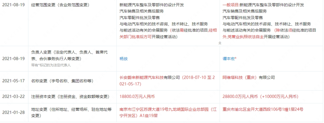 在长安汽车当年发布的“第三次创新创业计划”中,这家公司肩负着为长安孵化高端品牌的重任,不过后续因为合作没有多少进展,2020年8月,长安汽车发布公告,对长安蔚来增资,持股比例达到了95.38%,李斌卸任董事长。9个月后的2021年5月20日,长安蔚来新能源汽车公司宣布更名,阿维塔第一次出现在了人们的视野里。