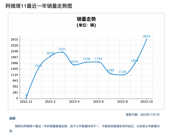 销量的转折点发生在9月,当月搭载华为智驾系统的问界新M7发布,激起了大众对于华为“遥遥领先”的智驾技术的兴趣。网上开始大量出现车主实测智驾车辆的“民间小视频”,这其中出镜率最高的,除了问界M5、M7外,就数同样被华为加持的阿维塔11了。也是从这个月起,阿维塔11销量重回上升态势,9月售出了1659台,环比增长了46.8%,10月时,创出了单月销售2825台的新高。