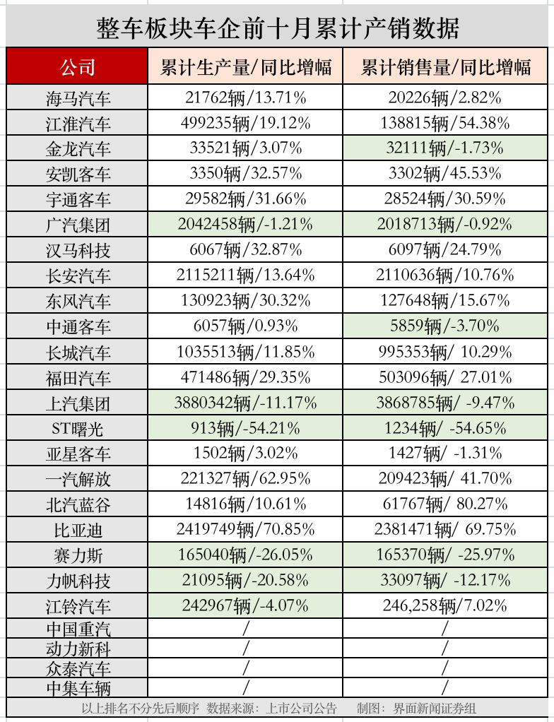 同时,21家整车车企中,上汽集团(600104.SH)、广汽集团(601238.SH)、ST曙光(600303.SH)、赛力斯(601127.SH)、力帆科技((601777.SH)5家前十个月累计整车产量、销量同比双降。