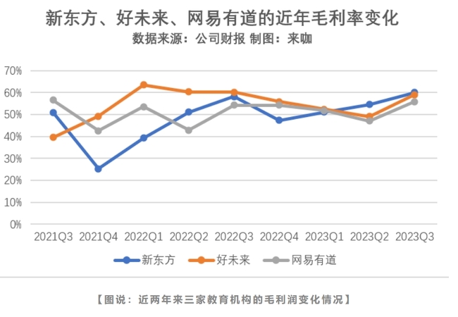 根据统计数据,新东方、好未来、有道三家教育机构,在经历了营收的低谷后,伴随着营收的企稳回升,毛利率也整体呈现出逐季增长的趋势,目前三家的毛利率都已经接近60%,甚至有的已经超过了双减前的水平。