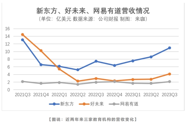在最新的三季度财报中,自今年初实现扭亏以来,新东方业绩持续向好,本季营收达到了11亿美元,同比增加47.7%;归母净利润为1.65亿美元,同比增长150.6%,营收与利润体量已经接近“双减”前水平。好未来营收也从上年同期的2.94亿美元上升到本季的4.12亿美元,同比涨幅为40.1%;归母净利润为3790.2万美元,实现了双减后的首次扭亏为盈;有道则以单季15.4亿元的营收创下历史新高,毛利率也达到近两年的高点,经营亏损进一步收窄。