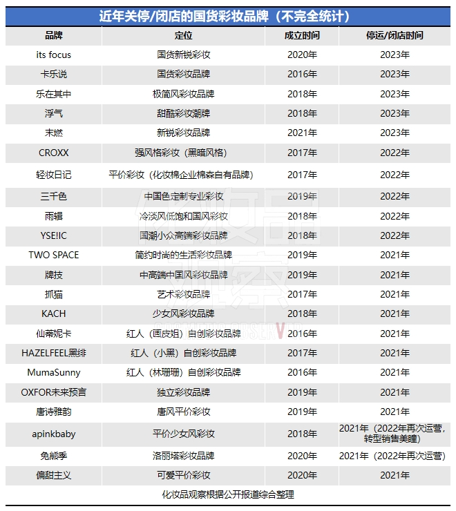 据《化妆品观察》不完全统计,今年截至目前已有5个国货新锐彩妆品牌传出关停或退出市场的消息;将时间维度拉长,从2021年至今,则有超过20个国产新锐彩妆品牌宣布闭店/停止运营。