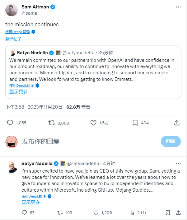 11月20日,奥特曼在社交平台上转发微软CEO萨提亚·纳德拉的推文并表示,“任务仍在继续”。随后,微软CEO萨提亚·纳德拉回复称,非常高兴奥特曼能加入这一团队并任CEO。