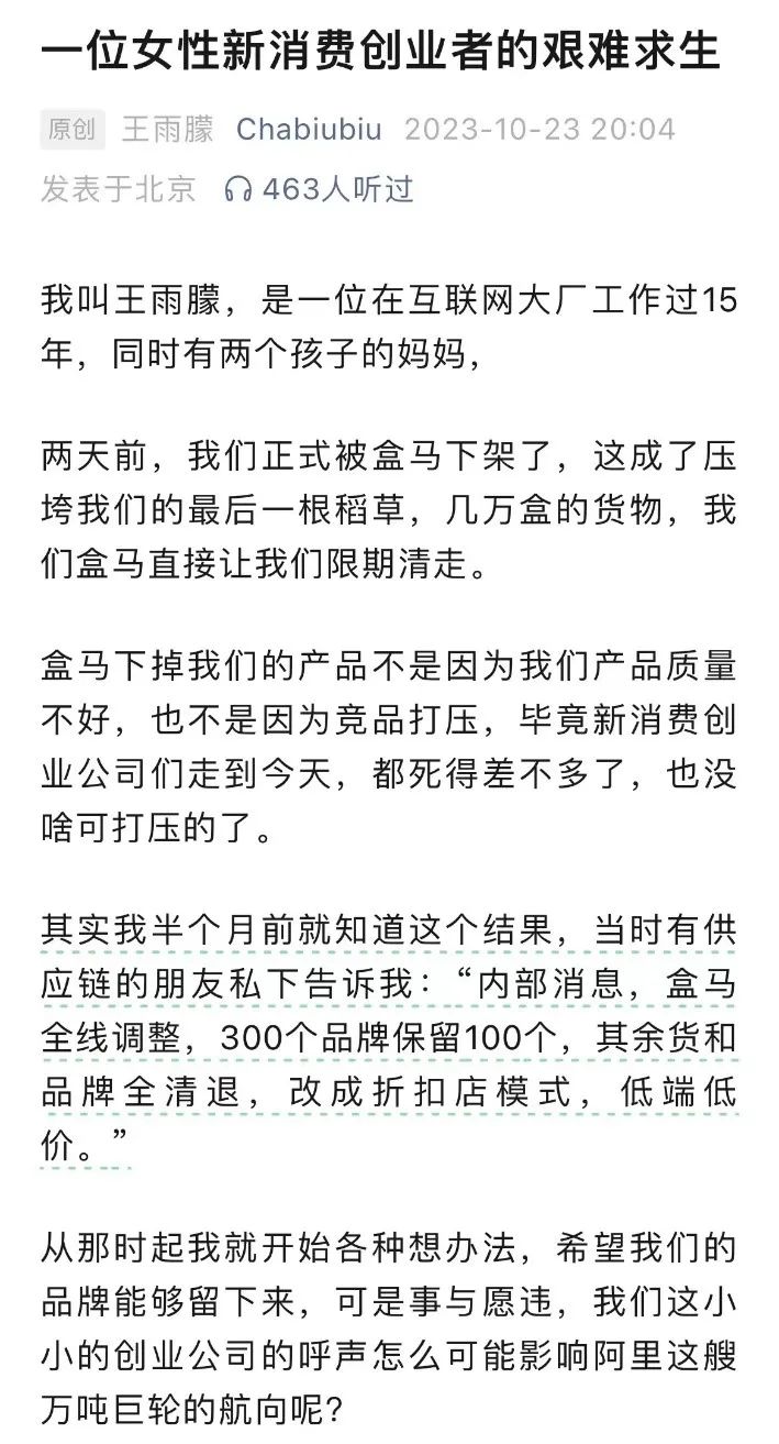 在盒马“折扣化改革”落地后的第十天,一则名为《一位女性新消费创业者的艰难求生》的文章在网上走红,作者是“Chabiubiu”创始人王雨朦。她在文章中写道,“两天前,我们正式被盒马下架了,这成了压垮我们的最后一根稻草,几万盒的货物,盒马直接让我们限期清走。”