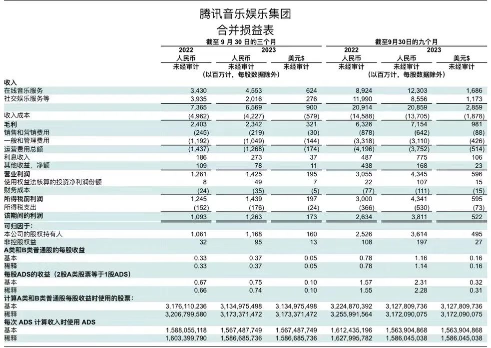 基于此,第三季度,腾讯音乐的毛利率从2022年同期的32.6%增长3.1%到35.7%,跨入到毛利率35-40%的中长期的目标中。