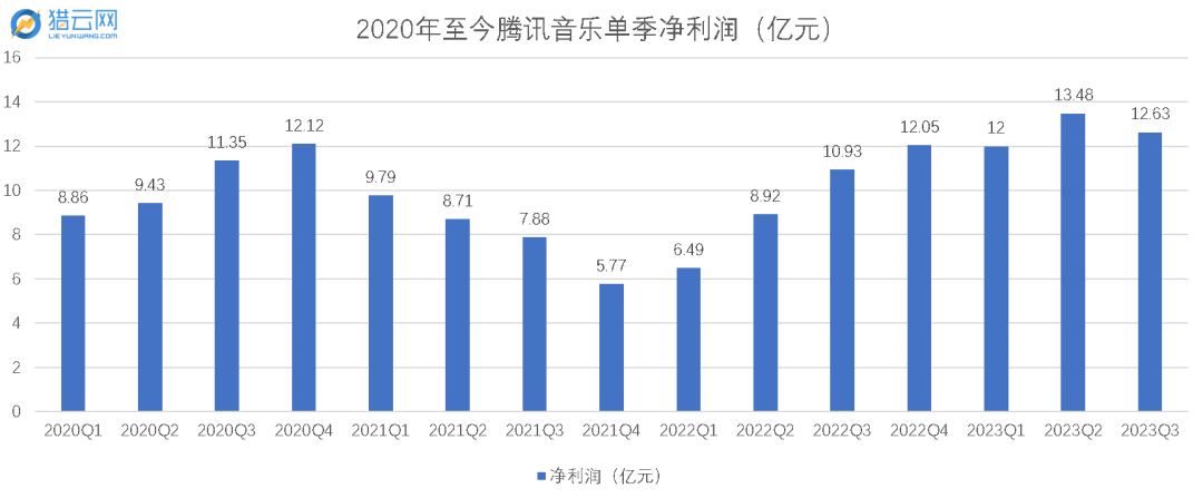 值得一提的是,第三季度虽然受社交娱乐服务业务收入下降的影响,腾讯音乐总收入同比下降10.8%至65.7亿元,成为2020年Q1以来营收最低的单季度,但净利润却同比增长15.6%达12.6亿元,事实上,从2022年Q1以来,腾讯音乐的净利润整体呈增长态势,从彼时的6.49亿元一路攀升至12.6亿元,健康度稳步提升。