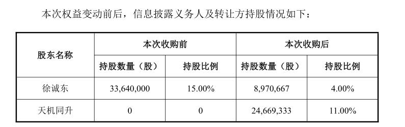 11月20日晚间,在停牌一个交易日后,*ST园城发布“控制权拟发生变更的提示性公告”,公司控股股东、实际控制人徐诚东于11月18日与天津天机同升科技有限公司(下称“天津天机同升”)签订了《股权转让协议》,徐诚东(持股比例15%)有意向出让其所持上市公司2466.93万股股份,占公司总股本的11%,转让价格14.3545元/股,转让价款合计3.54亿元。