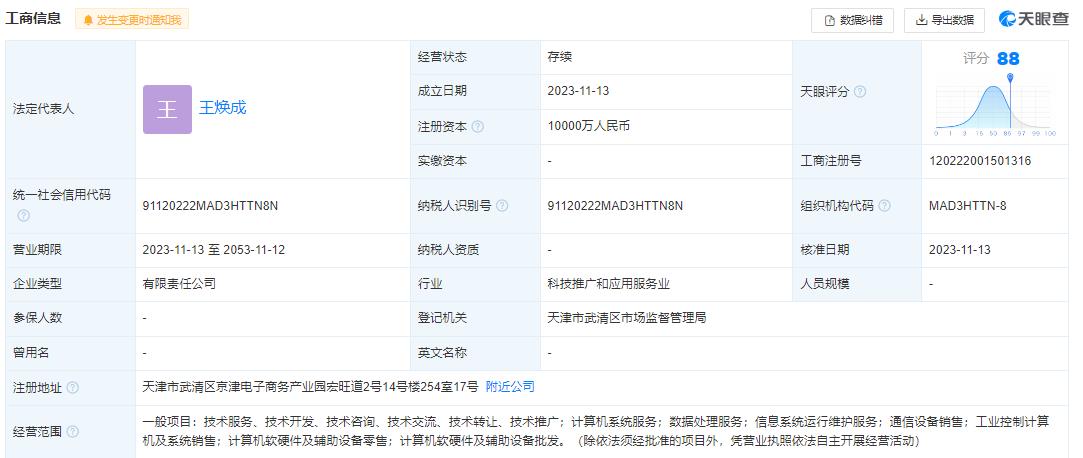 天眼查APP显示,天津天机同升注册地位于天津市武清区京津电子商务产业园,注册资本1亿元,经营范围包括技术服务、计算机系统服务数据处理服务、信息系统运行维护服务、通信设备销售、工业控制计算机及系统销售、计算机软硬件及辅助设备零售等。而在参保人数和实缴资本方面,公司暂未披露相关数据。