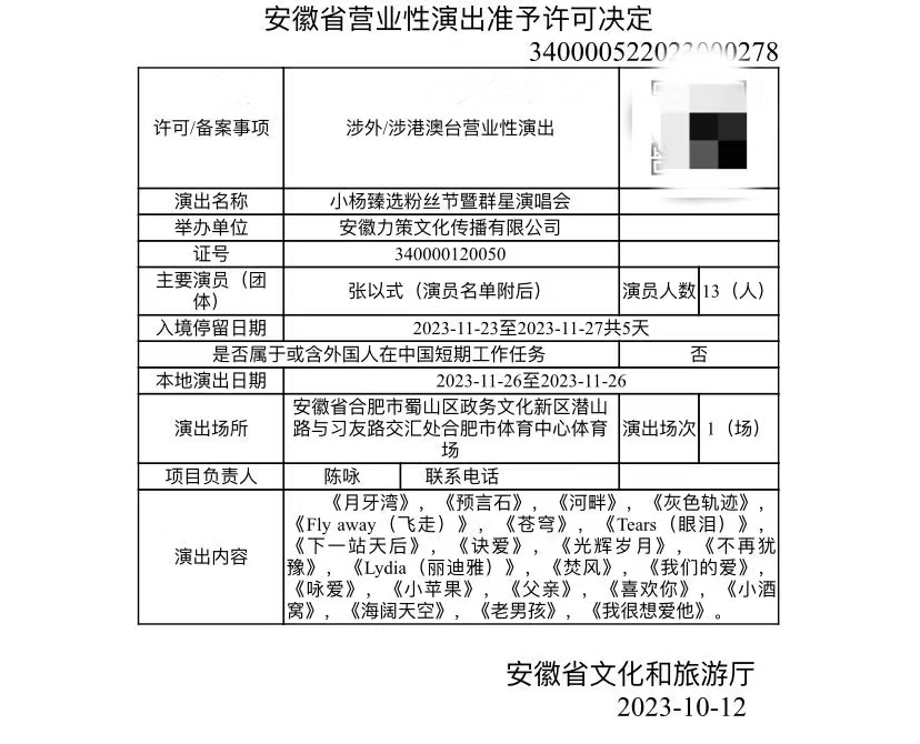 安徽省文化和旅游厅的一份演出准予许可文件透露了更多信息,“小杨臻选粉丝节暨群星演唱会”已经在10月12日通过审批,举办单位为安徽力策文化传播有限公司,演员人数为13人,其中以港台歌手为主。