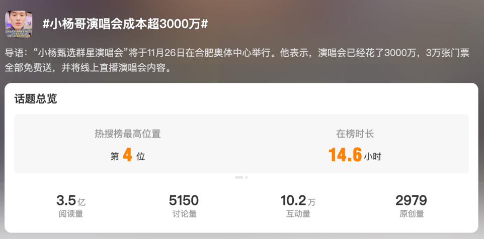 演唱会还未开播,小杨哥已经提早收获了一波流量。微博话题#小杨哥演唱会成本超3000万#已经有3.5亿的阅读量,以及超过10万的互动量,#小杨哥回应员工卖演唱会门票##小杨哥演唱会门票只送不卖#等话题也相继出现在微博热搜。