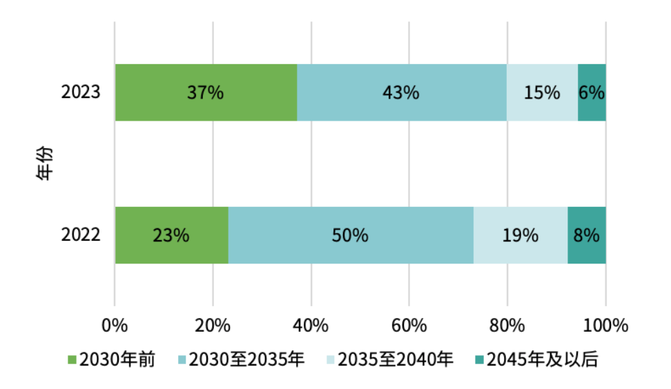 相比之下,专家对交通行业的达峰时间预测,整体晚于其他行业。不过,约37%的专家相信中国交通行业的碳排放能在2030年前达到峰值,相比去年大幅增加。