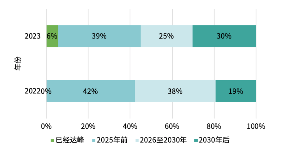 调研显示,6%的专家认为中国电力行业碳排放已经达峰,39%的专家认为2025年前可达峰,25%支持达峰时间在2026-2030年,剩余30%的专家则认为达峰时间在2030年后。