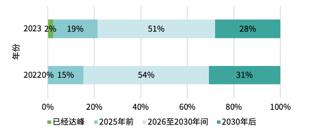 对于水泥行业,76%的专家认为将在2030年之前到达碳排放峰值。其中,约21%的专家认为水泥行业的碳排放已经见顶。