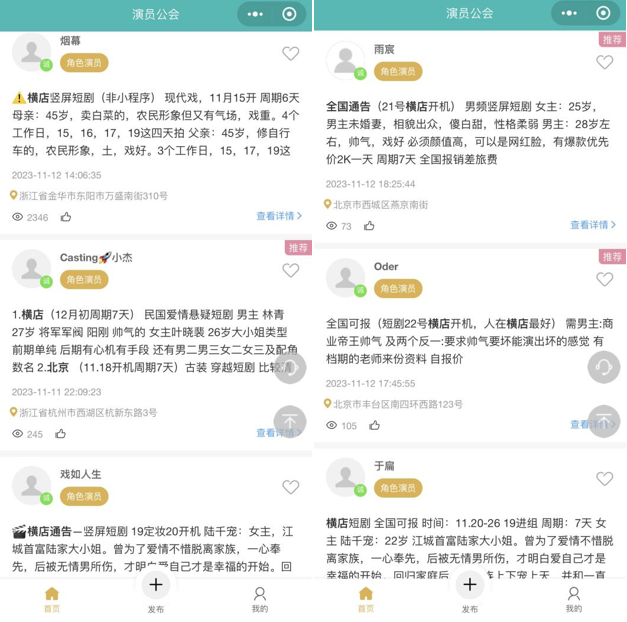 11月15日,在“演员工会”小程序上,《豹变》随机统计了前50条横店演员招募信息,其中有33条是短剧剧组发布的,占比近七成,年龄多要求为20多岁。