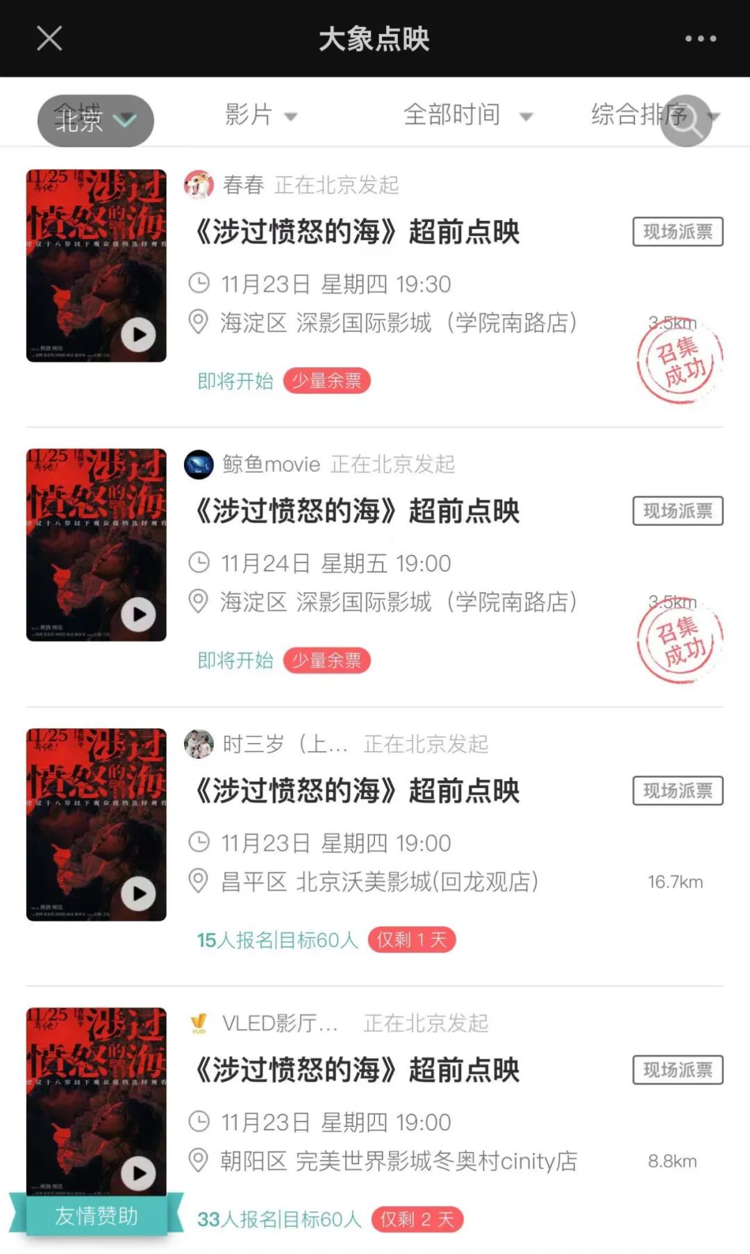 乃至到了即将启动的点映、路演阶段,《怒海》也明显着重控制了规模人群。此次该片选择的大象点映平台独家点映的策略在行业内都不算多见。由KOL申请开团,在11月23日和24日于16个城市限量开场,只有在参与人数成团后才能够顺利点映。影迷爱用平台+核心受众群体,这样的精准操作有望最大程度保障汇集目标受众和正向口碑反馈。