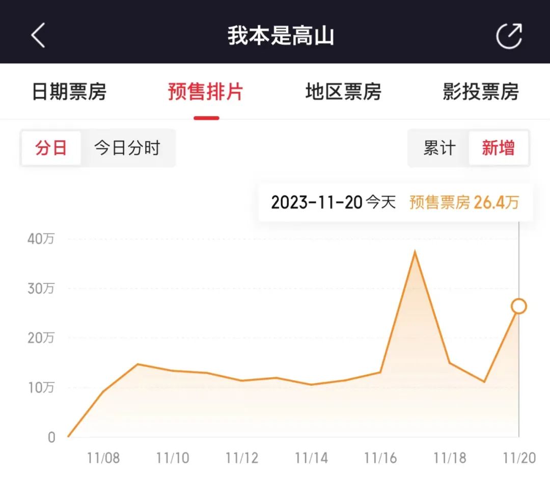 从预售数据来看,在《高山》开启点映首日,该片创造了近期预售日增最高纪录,随后的周末两天却因舆情原因直接出现断崖式下降。
