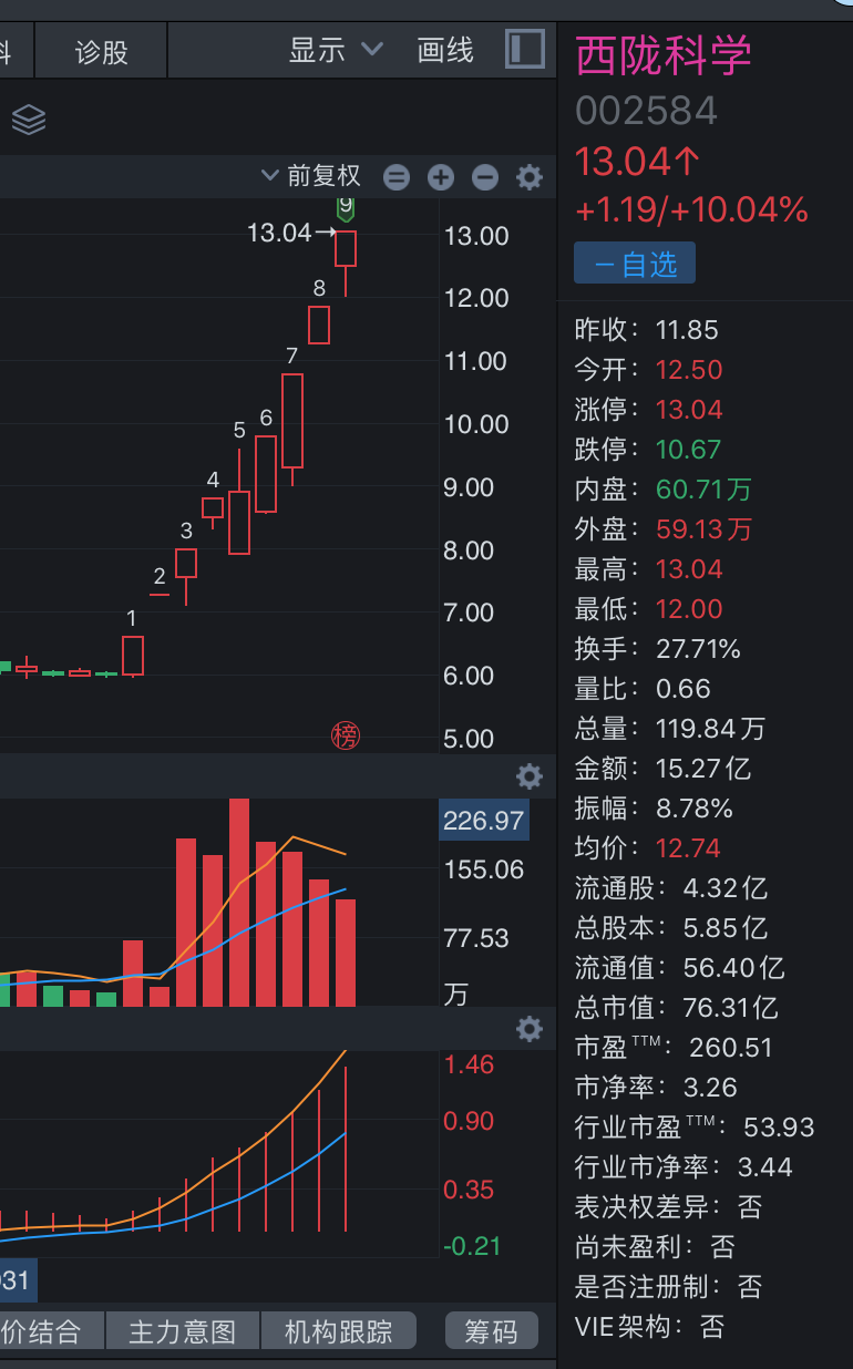 9个交易日8个涨停板,累计涨幅116.97%,西陇科学(002584.SZ)近来光芒很盛,甚至成了市场心目中“跨年妖股”的候选。