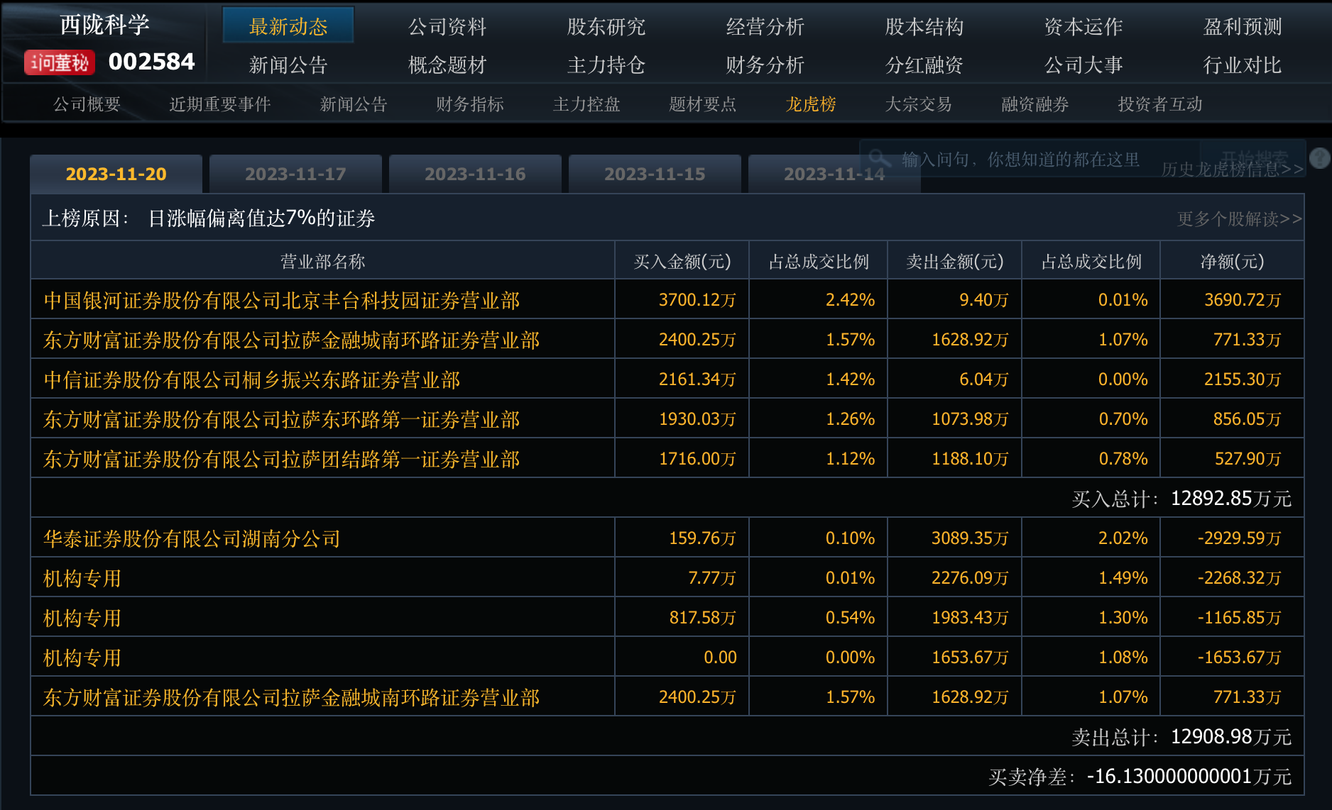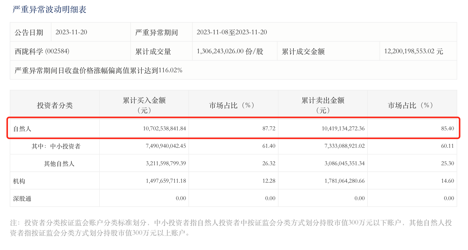 由于连续的大涨,西陇科学构成了严重异常波动,据深交所的数据,2023年11月8日至11月20日区间,自然人参与买入占87.72%,卖出占85.4%;机构买入和卖出的金额占比则分别为12.28%和14.6%。
