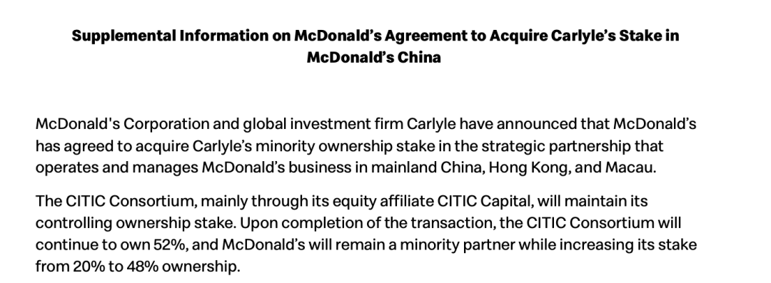 本次交易完成后,麦当劳在金拱门(注:麦当劳在华运营主体的简称)的持股比例将从20%增至48%,以中信资本为主的中信联合体将继续持有52%股份。