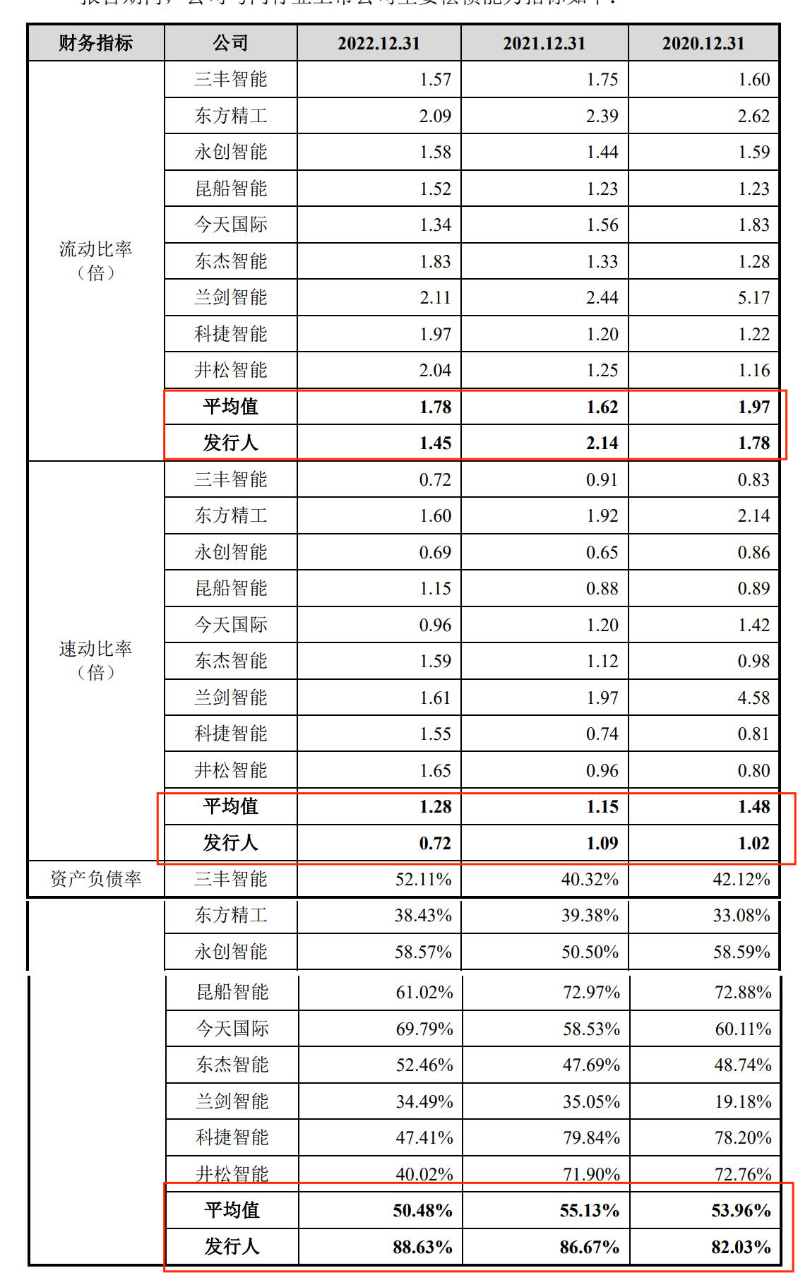 同期,衡量企业流动性偿债能力的重要财务指标速动比率分别为1.02、1.09、0.72,低于行业可比公司平均值1.48、1.15、1.28。