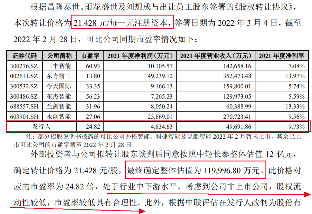 中轻长泰回应上交所资料显示,刘想成等外部投资者收购公司股权时,转让价格为21.428元/每一元注册资本,整体估值约为11.9997亿元,此价格对应的市盈率为24.82倍。