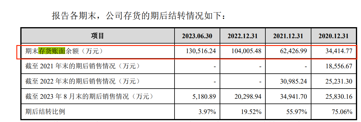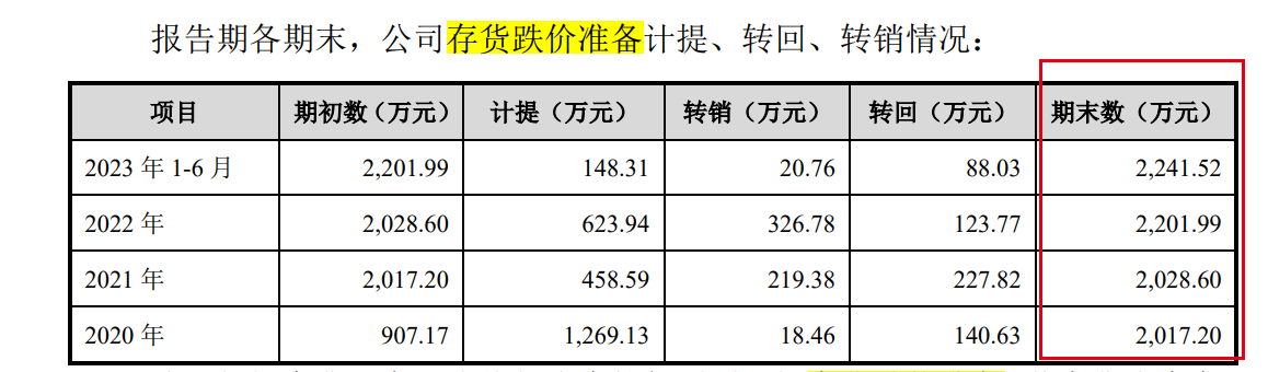 招股书显示,2020年-2023年6月,公司存货账面余额快速增长,分别为 3.44亿元、6.24亿元、10.40亿元、13.05亿元。为此,公司每年都计提2000万元以上的存货跌价准备。