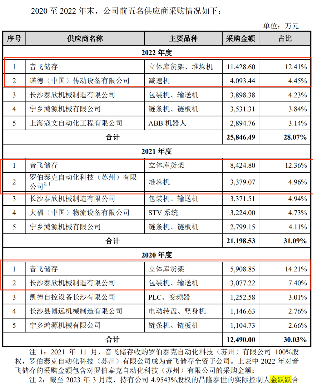 在招股书中,中轻长泰2021年对于罗伯泰克的采购金额并未加至音飞储存,若加入,音飞储存的采购金额将“遥遥领先”其他供应商。
